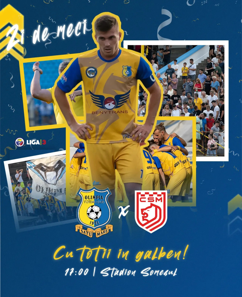 #BăiețiiDePeSomeș vor juca azi în tradiționalul echipament galben. Vă îndemnăm să veniți și voi la stadion cu tricouri galbene pentru a colora întreaga tribună și pentru a susține împreună Olimpia!