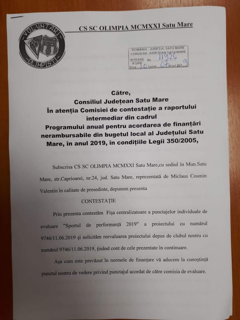 Conducerea clubului nostru contestat azi decizia Consiliului Judetean Satu Mare depunand o contestatie dupa cum se poate vedea in imaginea de mai jos.
