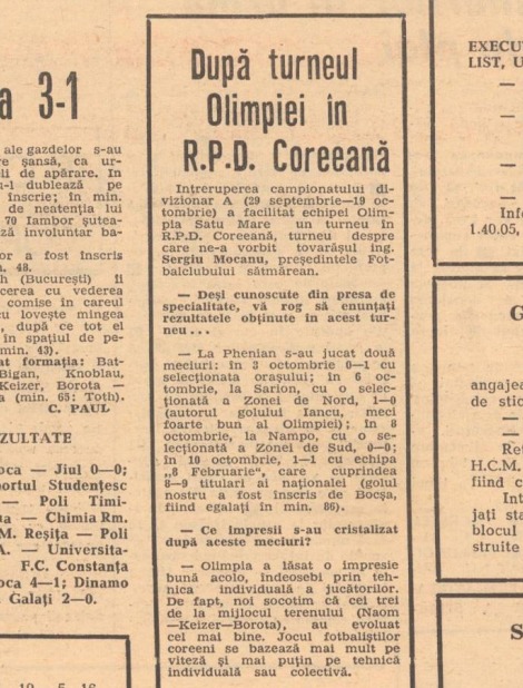 Fiind pauza de iarnă, începem cu un turneu de pregătire din 1974, datorat pauzei competiționale de atunci. Un turneu mai diferit deoarece a avut loc în Republica Populară Democrată Coreeană, Coreea de Nord. La Phenian sătmărenii, insoțiți de președintele clubului de atunci, Sergiu Mocanu, au desfășurat 2 partide iar apoi s-au deplasat în orașul Nampo unde au mai susținut 2 jocuri.