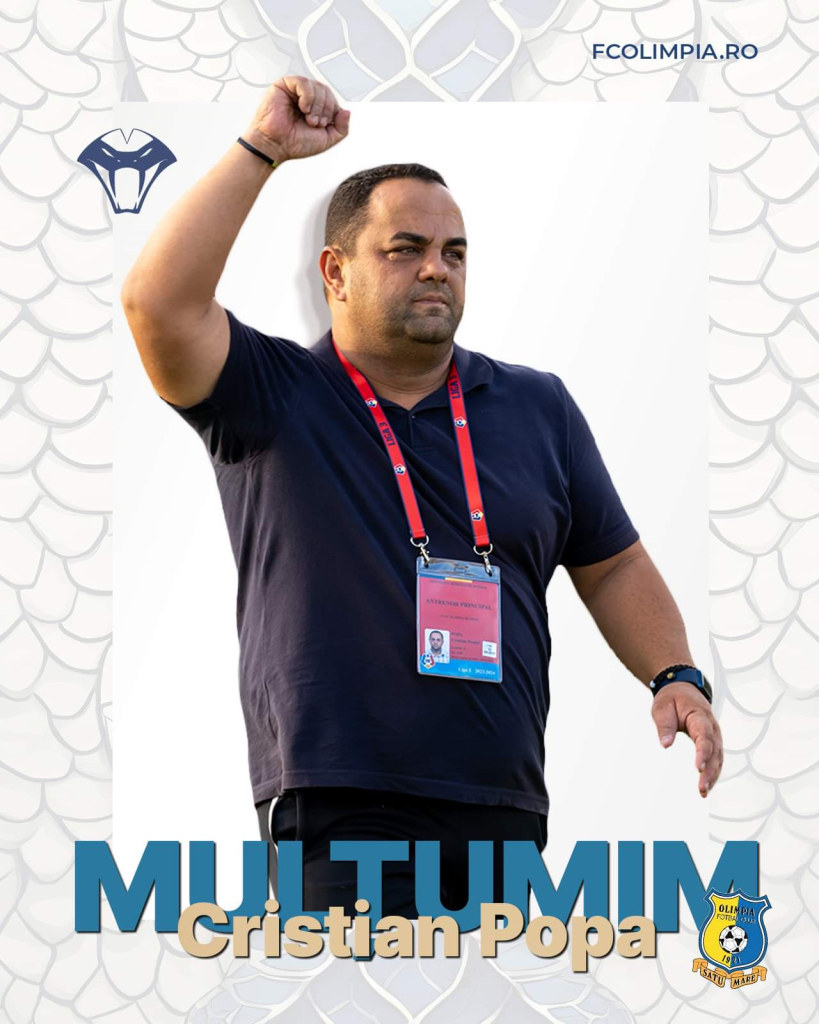 Clubul Olimpia Satu Mare, cu acordul părților, anunță despărțirea de Cristi Popa, care până în prezent a ocupat funcția de antrenor principal pentru băieții de pe Someș. Rezilierea contractului se va semna în cursul zilei de mâine. Profităm de acest moment pentru a-i transmite mulțumiri lui Cristi pentru contribuția sa la echipă. Ne leagă multe momente frumoase, iar mereu ne vom aminti de antrenorul care a readus Olimpia în fotbalul mare. Orice poveste frumoasă are și un sfârșit, iar noi ne vom continua drumul înainte așa cum v-am obișnuit. Îi urăm mult succes și noroc în viitoarele sale provocări de antrenor.