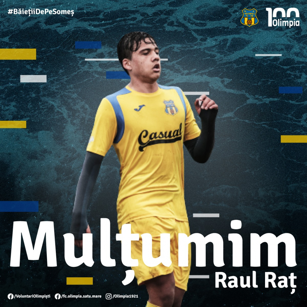 Olimpia Satu Mare, anunță că s-a despărțit de un nou jucător, fiind vorba de tânărul Raul Raț, care a făcut un pas înainte în cariera, iar din sezonul viitor va evolua în liga a III-a din Ungaria, la echipa Gyirmót FC Győr.