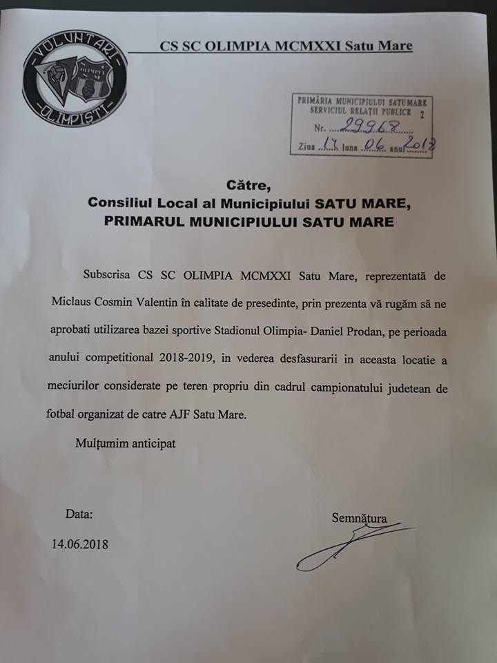 De asemenea trebuie să amintim și de deschiderea arătată de domnul Fogel Laszlo, președintele Clubului Sportiv Municipal Satu Mare care în întâlnirea pe care am avut-o miercuri 13 iunie 2018 si-a arătat interesul de a ajunge la un numitor comun privind folosirea Stadionului Olimpia Daniel Prodan.