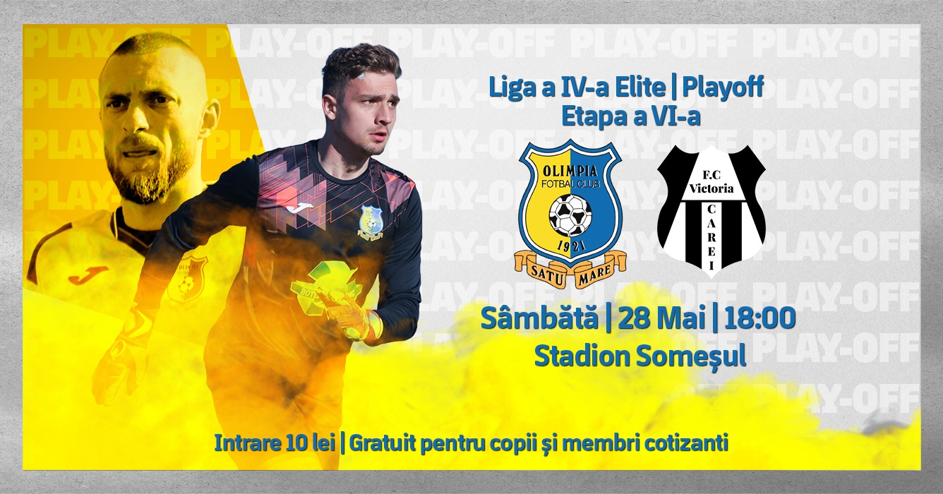 Olimpia Satu Mare înfruntă sâmbătă, 28 Mai, echipa aflată pe prima poziție în clasamentul play-off-ului, Victoria Carei. Partida se va disputa pe stadionul Someșul de la ora 18:00,...