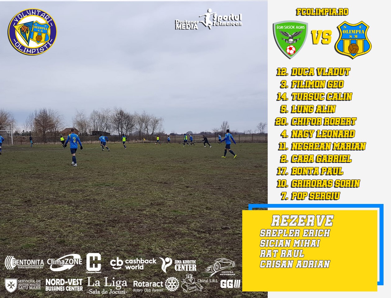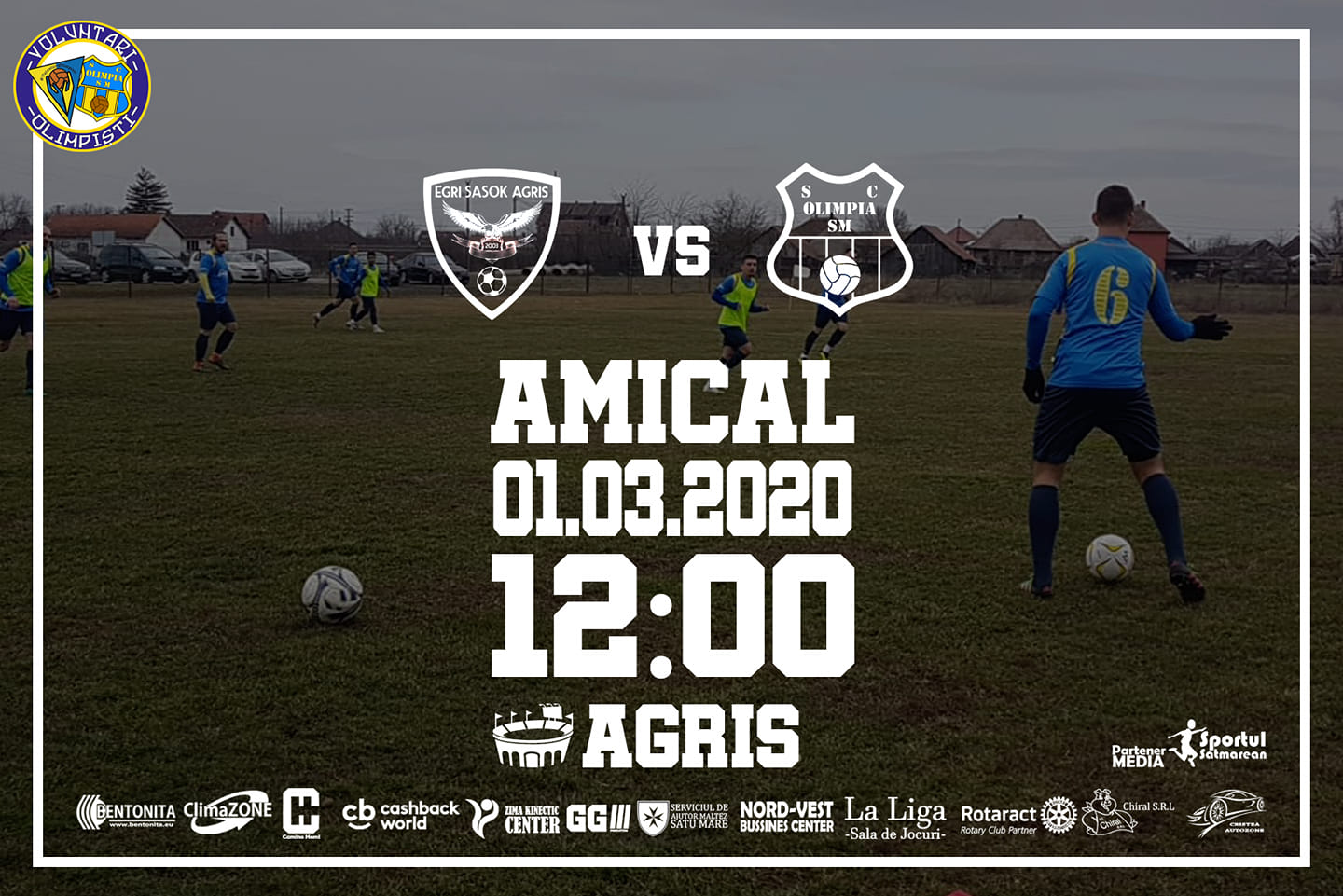 Duminică, 1 martie 2020, de la ora 12:00, Olimpia Satu Mare întâlnește pe terenul din Agriș, echipa din localitate, Egri Sasok, în ultimul meci de pregătire din pauza...