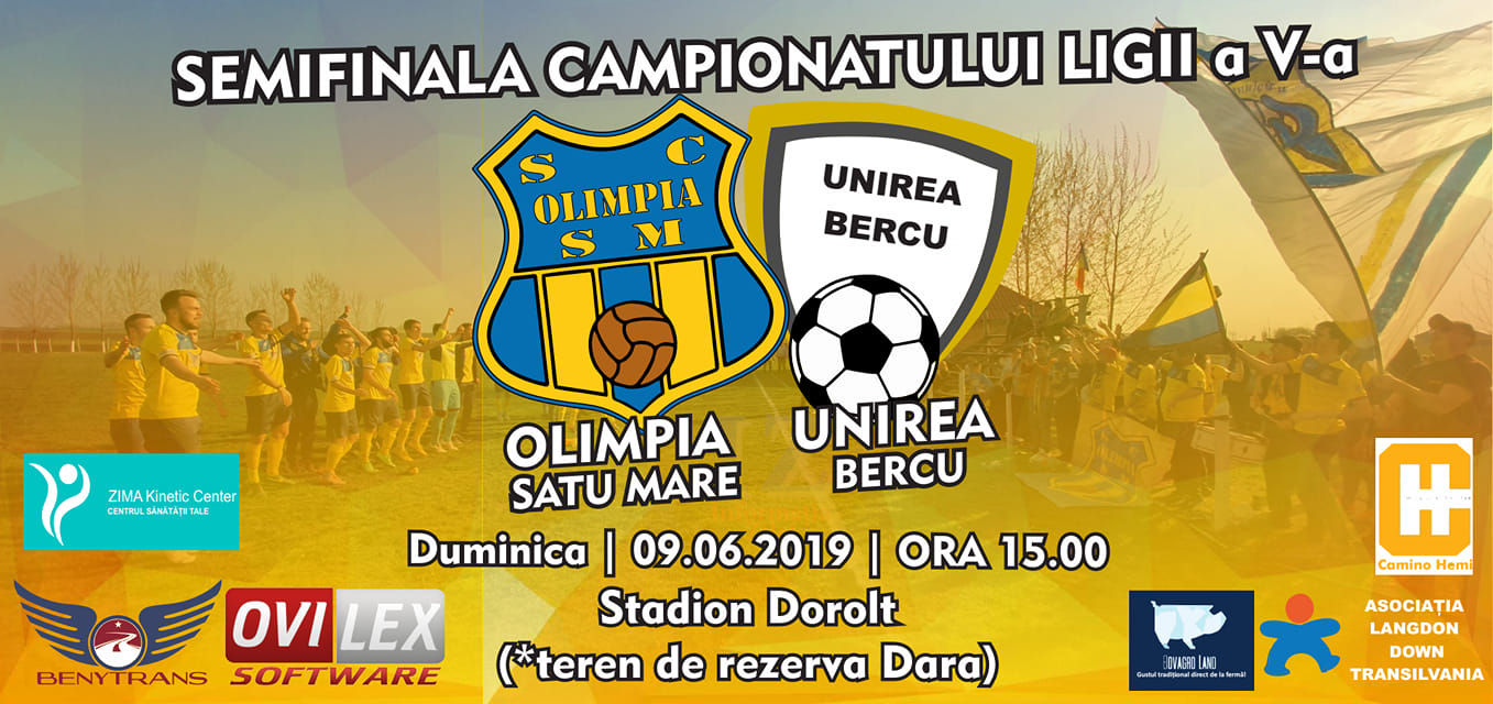 Duminica, 9 iunie 2019, cu începere de la ora 15:00, Olimpia MCMXXI Satu Mare întâlnește pe Unirea Bercu într-un meci ce contează pentru semifinala campionatului ligii a V-a....