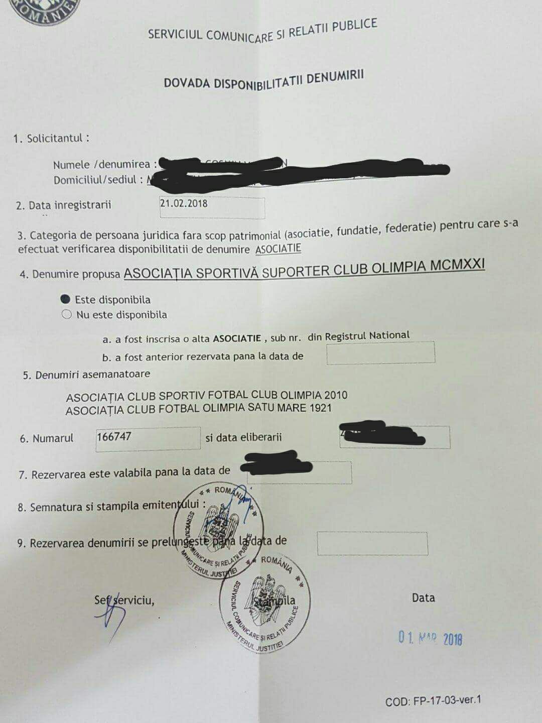 Dupa cum probabil stiti VoluntariOlimpisti a obtinut dovada rezervarii unui nume pentru a continua povestea Olimpia Satu Mare.